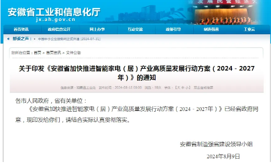 为推动“大家电做强、小家电做大、智能家居做优、配套体系做全”,推进安徽省智能家电(居)产业向高端化、智能化、绿色化转型升级,近日,安徽省制造强省建设领导小组印发《安徽省加快推进智能家电(居)产业高质量发展行动方案(2024-2...